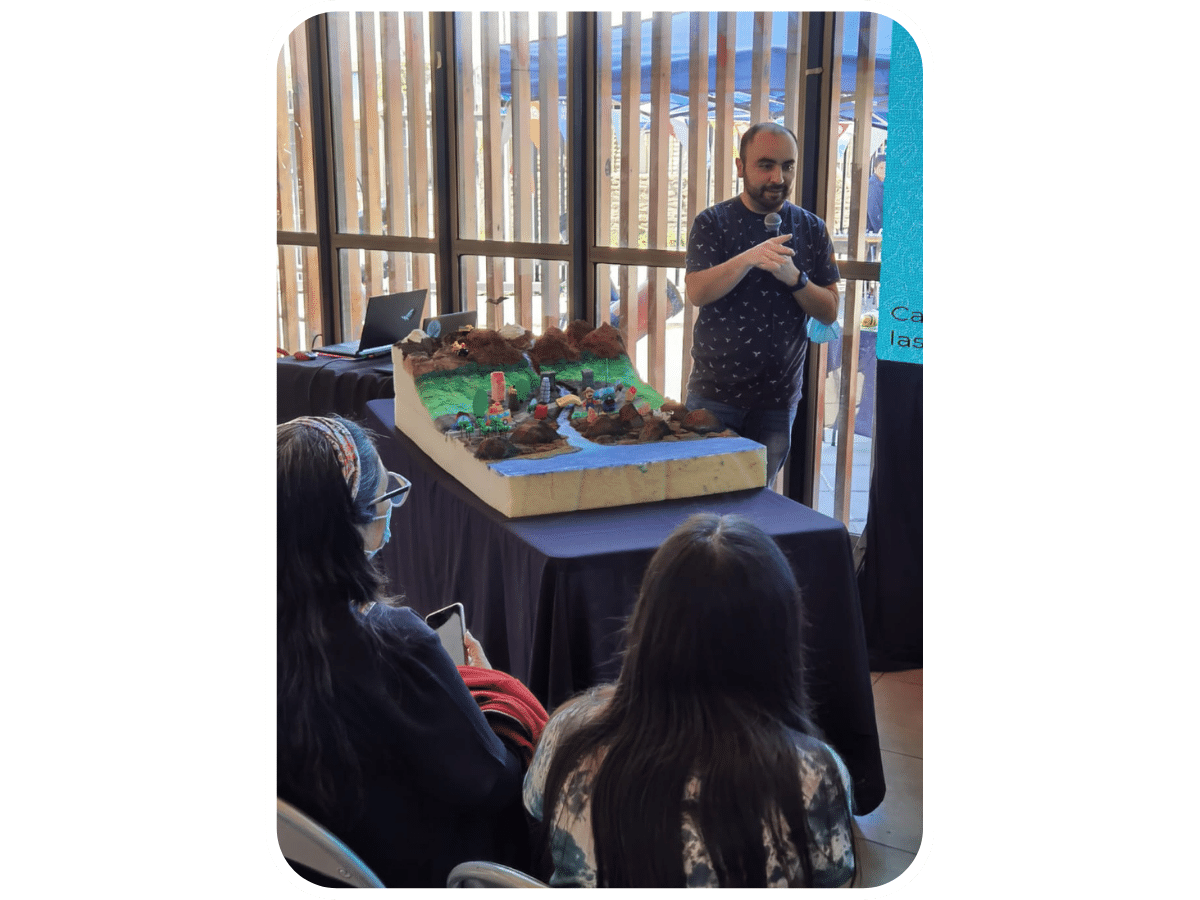Aprovechando el impulso de la jornada anterior, nuestra Fundación volvió a hacer uso de la maqueta para explicar el comportamiento de los ríos Mapocho y Maipo, y la importancia del cuidado del agua en nuestra región. A diferencia del FECI 2022, el público en esta ocasión estaba compuesto principalmente por familias. Andrés, que repitió el plato, opinó que “fue muy interesante realizar este taller para todo público, porque, a partir de las preguntas que realizaban, uno se da cuenta sobre qué preocupa más a unas generaciones y otras. Por ejemplo, los adultos se preocuparon más acerca de la posible escasez de agua a futuro y qué implicaba, mientras que los niños plantearon ideas y comentarios relacionados a cómo debemos cuidar el ambiente y qué acciones debemos tomar -como disminuir el consumo de carne- para cuidar el agua”. Además, Andrés también recalcó sobre la importancia de que se hagan estas ferias científicas para todo público, ya que son realmente importantes para acercar el conocimiento científico a toda la población.
